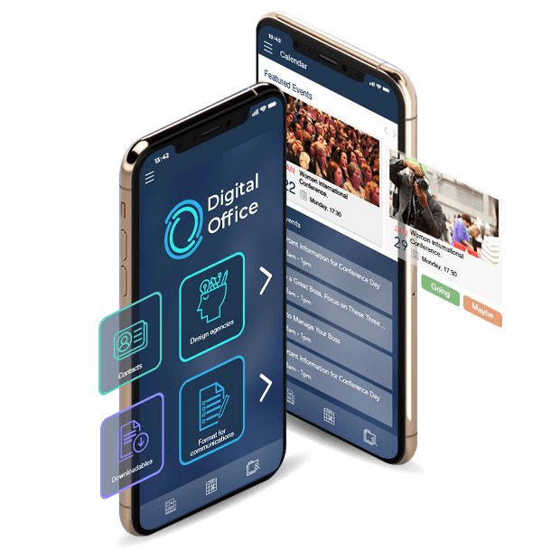 App diseñada exclusivamente para comunicación interna de la consultora, funcionalidades de directorio, noticias, calendario y agenda de eventos y realización de trámites.